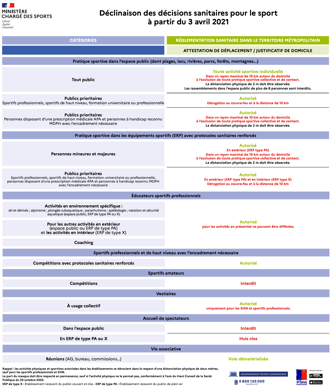 -> Télécharger le tableau complet des décisions sanitaires gouvernementales pour le sport (au 03 avril 2021)